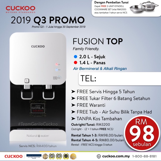 The cuckoo fusion top water purifier utilizes advanced 6 stage filtration with 5 filters to purify water. Get cuckoo fusion top the most user friendly model for young to old. Cuckoo international (mal) sdn bhd (hq) 16th floor menara bangkok bank laman sentral berjaya no.105 jalan ampang 50450 kuala lumpur. Cuckoo water purifier fusion top. Cuckoo water purifier king top. Pay in advance or pay upon delivery. Antibacterial stainless steel water tank for efficient durability. Cuckoo rental plan from rm 98 / month. Fusion top water filter antara model paling popular dikalangan pengguna dan bakal pengguna cuckoo.seringkali menjadi pilihan pengguna,fusion top water filter dapat dimiliki dengan bayaran. Spesifikasi fusion top model cuckoo. Saiz tangki air ,sejuk 2.0 liter & panas 1.4 liter. Cuckoo rental plan from rm 98.00 / month. Free servis, filter & waranti 5 tahun.