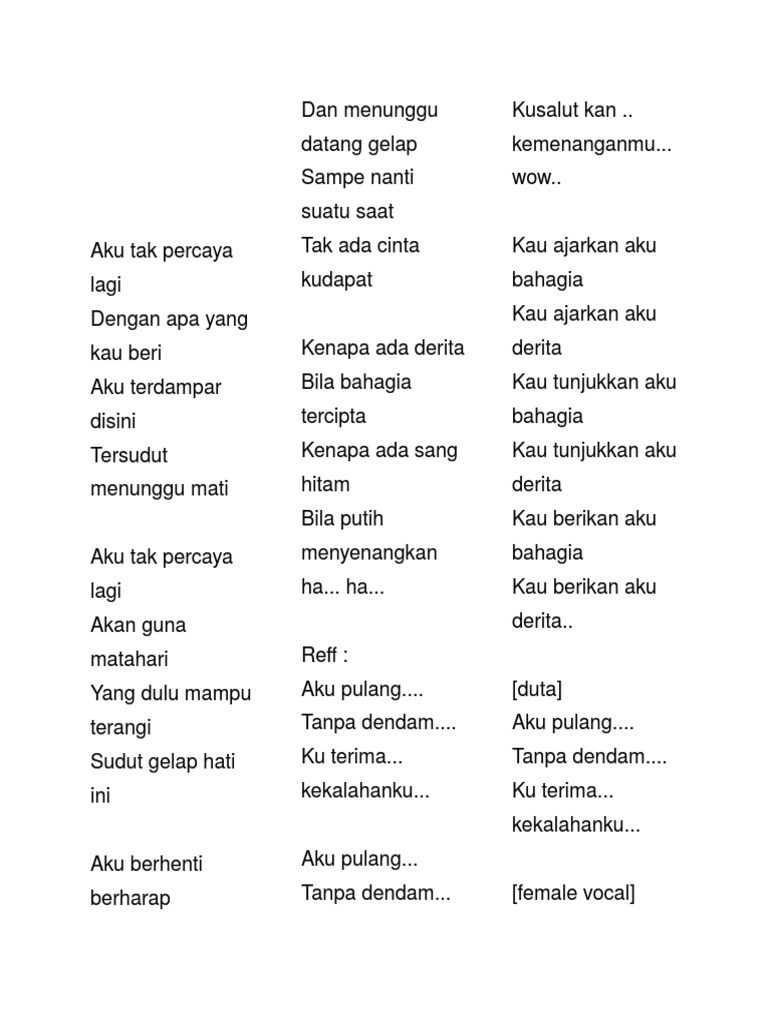 Aku tak percaya lagi mp3 & mp4. Sayang aku memaafkanmu karena kau tak akan mengulanginya mengkhianati cinta kita yang terus kau lakukan ini yang terakhir kalinya aku memberikan maafku aku tak mau percaya lagi karena kau sering mengkhianati oh… tak mau percaya lagi tak kan tak akan percaya lagi aku tak mau. Aku tak percaya lagiaku tak percaya lagi. Tapi kau jangan lupa, bila ada juga manusia yang tidak. Download lagu mp3 & video: